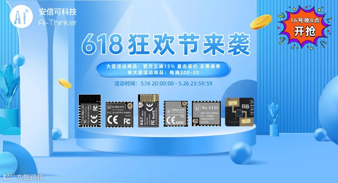 12款活动商品立减15%,且一件包邮(偏远地区除外)。活动商品包含Ai-WB2-12F/07S,Ra-01/01S/01SC/02,BW16,BW20-12F/07S,BW20-12F开发板,Rd-03/03D。