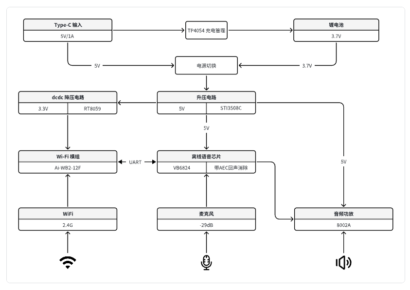 VB6824 实现语音唤醒词识别与音频编解码,通过 UART 与 Ai-WB2-12F 交互;