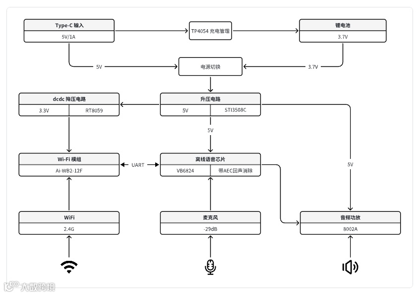 答:升压的目的是确保功放芯片在电池供电情况下,能保持供电稳定,从而保持音质一致。降压电路主要是为了给 WiFi 模组和音频芯片供电。