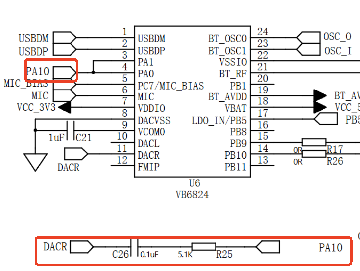喇叭输出引脚(DACR)串联 0.1uF 电容和 5.1KΩ电阻接入 PA1 和 PA0;