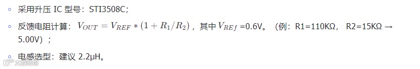 升压输出:电池供电时通过升压芯片(如 STI3508C)输出 5V 系统电压;