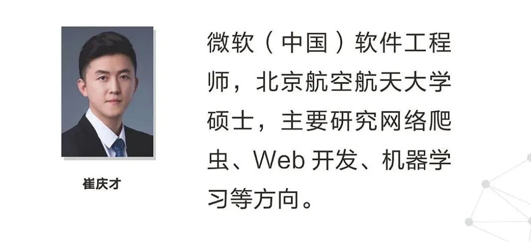 崔庆才,微软(中国)软件工程师,北京航空航天大学硕士,主要研究网络爬虫、Web 开发、机器学习等方向。