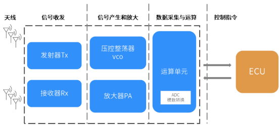 利用高频电路产生特定调制频率(FMCW)的电磁波,并通过天线发送电磁波和接收从目标反射回来的电磁波,通过发送和接收电磁波的参数来计算目标的各个参数。