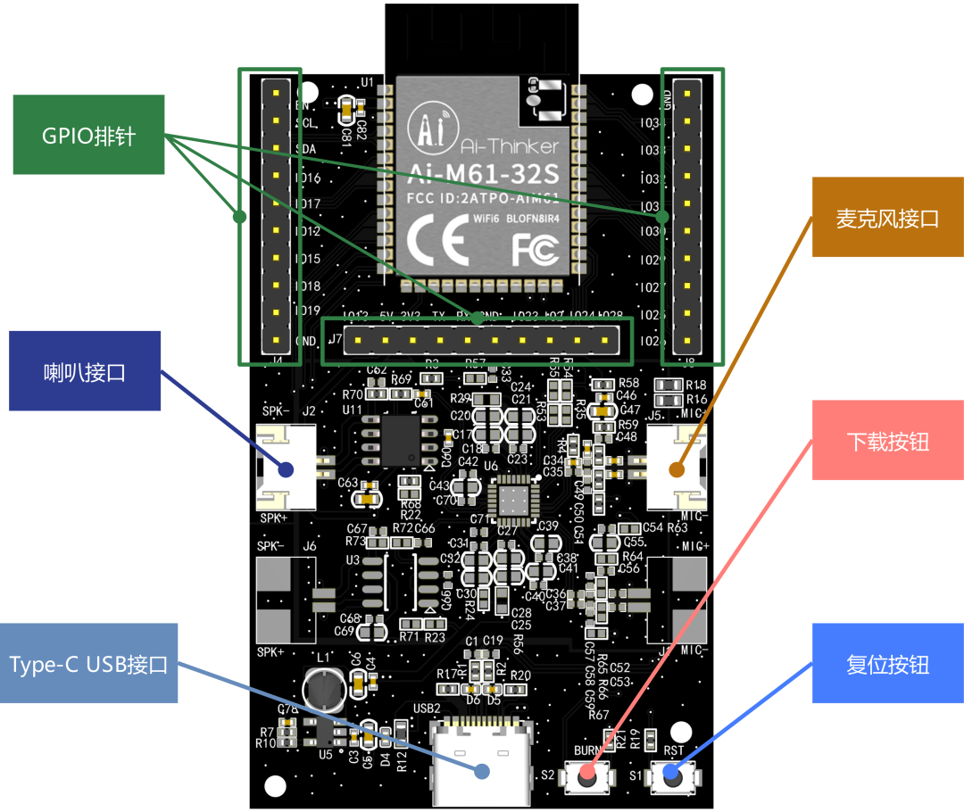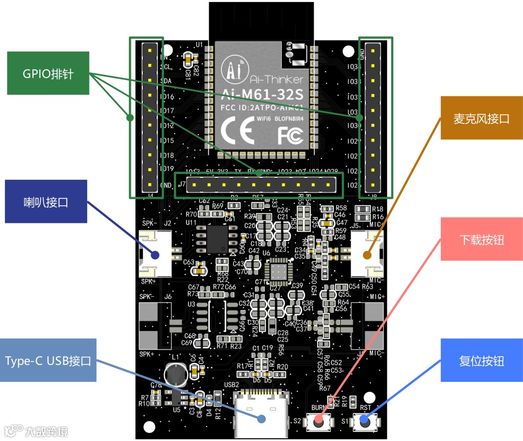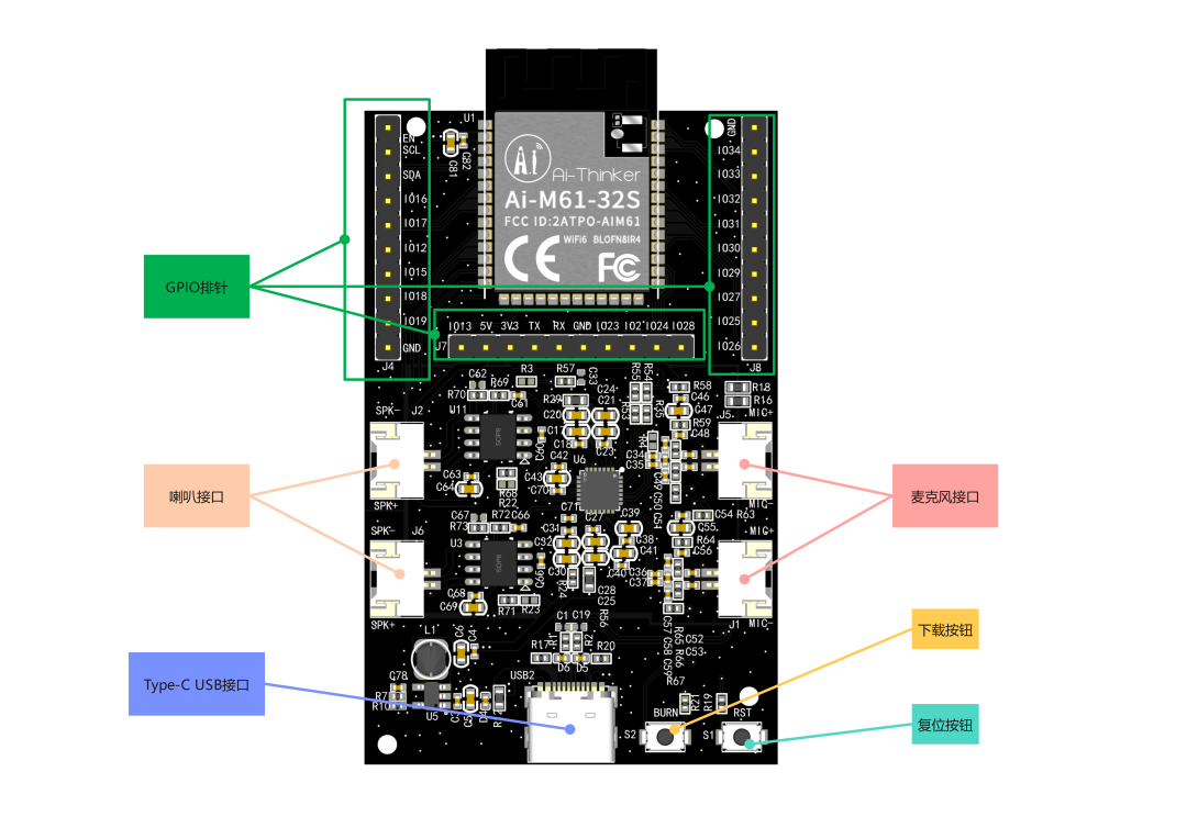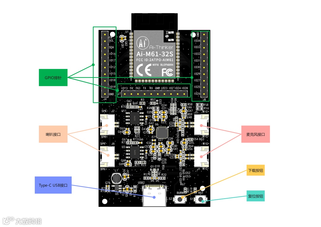 所搭载的Ai-M61-32S 模组具有丰富的外设接口,具体包括 DVP、MJPEG、Dispaly、AudioCodec、USB2.0、SDU、以太网 (EMAC)、SD/MMC(SDH)、SPI、UART、I2C、I2S、PWM、GPDAC、GPADC、ACOMP 和 GPIO 等。