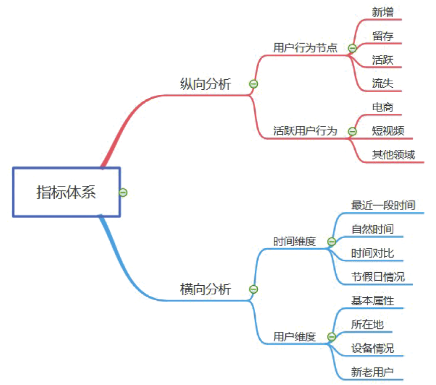 可以看到,针对新增、活跃、留存/流失这些节点,可以纵向设计出很多指标,但主要是绝对数量和百分比。