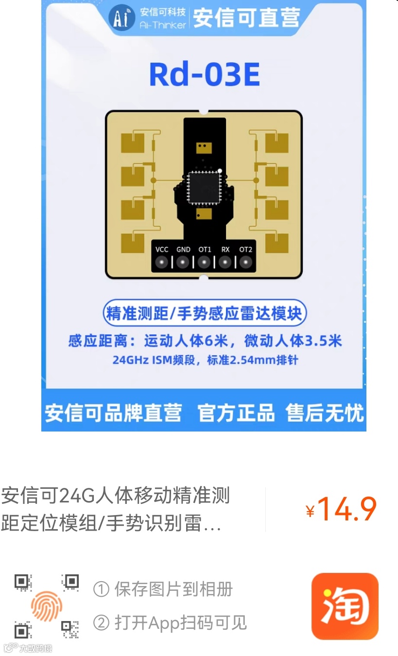 Rd-03尺寸为20.0*20.0mm,体积小,即插即用,实时上报探测结果,更利于用于小型化智能单品中。