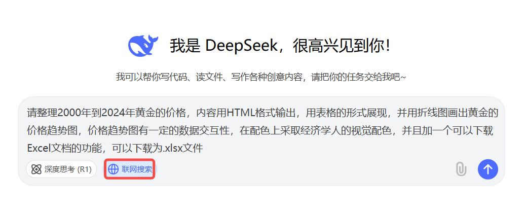 首先打开DeepSeek官网,打开联网搜索功能,在输入框中输入下面的提示词: