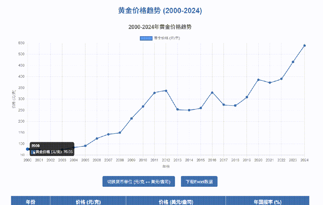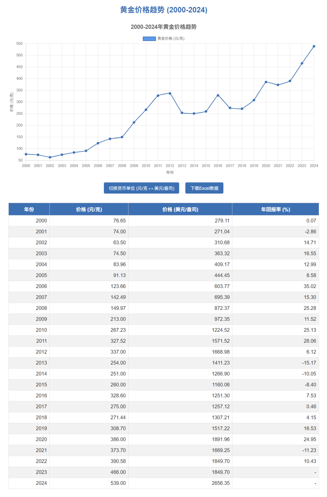 请整理2000年到2024年黄金的价格,内容用HTML格式输出,用表格的形式展现,并用折线图画出黄金的价格趋势图,价格趋势图有一定的数据交互性,在配色上采取经济学人的视觉配色,并且加一个可以下载Excel文档的功能,可以下载为.xlsx文件