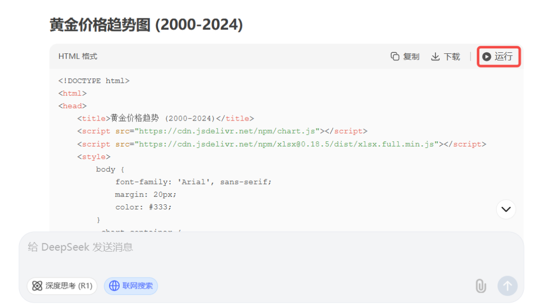 接着,我们往下翻,可以看到DeepSeek还生成了HTML代码,在生成的HTML代码这一块点击运行按钮,可以预览代码生成的结果。