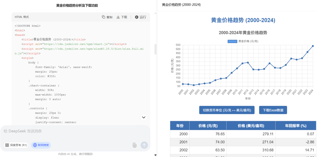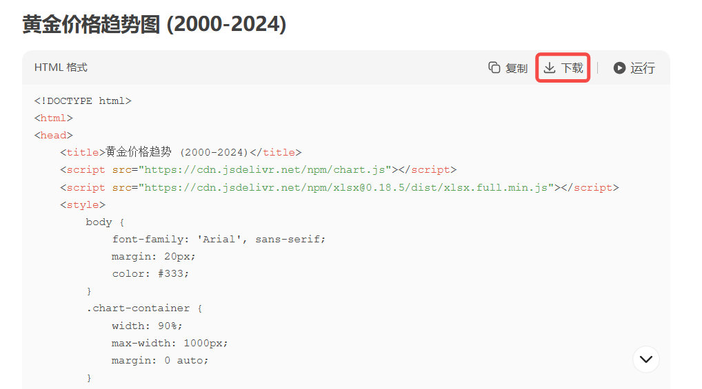 打开HTML文件,可以清晰地看到黄金价格走势,并支持下载Excel文件。