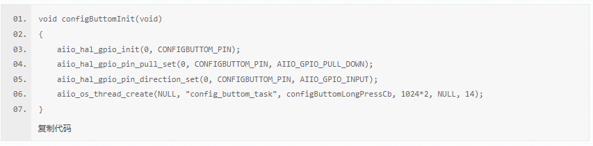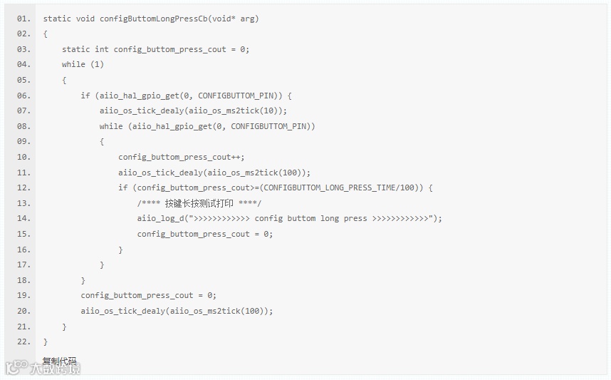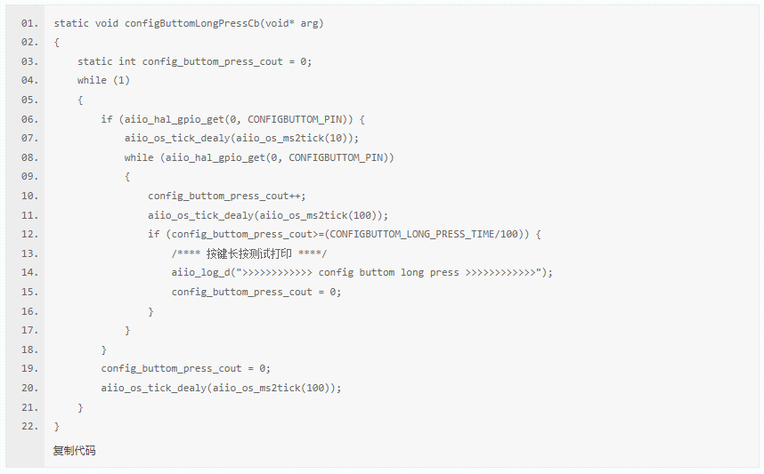 Ai-WB2-12F 开发板要进入配网,需要有个控制方式,开发板上的IO8按键正好可以使用,读取IO8按键,高电平长按2s 后进入配网。