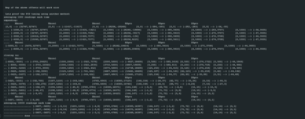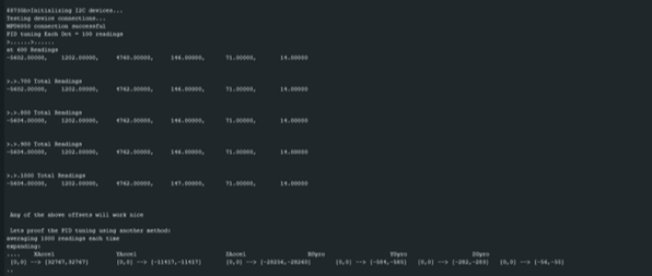 正如穿插的标题行所示,组成这一行的六组分别描述了 X 加速度、Y 加速度、Z 加速度、X 陀螺仪、Y 陀螺仪和 Z 陀螺仪的最佳偏移量。 在上面的示例中,试验显示 +567 是 X 加速度的最佳偏移量,-2223 是 Y 加速度的最佳偏移量,以此类推。