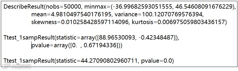 # 单样本检验import numpy as npfrom scipy import statsrvs1=stats.norm.rvs(loc=5,scale=10,size=50000)#均值为5,标准差为10的正态分布,随机随机生成50000个样本display(stats.describe(rvs1))#输出统计特征值display(stats.ttest_1samp(rvs1,[1,5]))#单样本与均值=1比较,拒绝原假设(均值存在差异),# 与均值=5比较,接受原假设(均值不存在差异)display(stats.ttest_1samp(rvs1,3))#样本与均值=3比较,p=0.0,拒绝原假设(均值存在差异)
