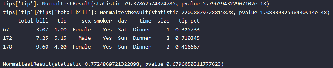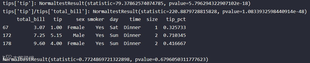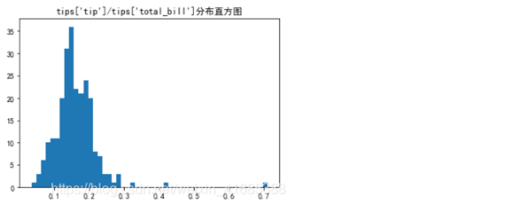 '''某餐厅顾客消费记录.解释数据结构:total_bill:消费,tip:小费,sex:服务员性别,smoker:是否抽烟,day:星期几,time:午餐/晚餐,size:本桌人数数据源:https://download.csdn.net/download/weixin_41685388/12144418'''tips = pd.read_csv(r"E:\tips.csv",encoding='utf-8')#导入csv格式数据display(tips.sample(5))#随机抽样5行print("tips['tip']:",stats.normaltest(tips['tip']))#结果拒绝tips['tip_pct']=tips['tip']/tips['total_bill']plt.hist(tips['tip_pct'],bins=50)#视图感性分析:很像正态分布plt.title("tips['tip']/tips['total_bill']分布直方图")print("tips['tip']/tips['total_bill']:",stats.normaltest(tips['tip_pct']))#结果拒绝"""但是结果比较奇怪,猜测是图像右边尾巴的异常点引起的。"""print(tips[tips['tip_pct']>0.3])#查看异常点,只有三个tips1=tips.drop([67,172,178])#异常点太少也不好分析,直接去除stats.normaltest(tips1['tip_pct'])#结果接受原假设