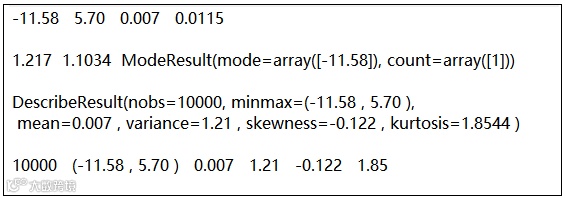 # 例:生成一个t分布序列import numpy as npfrom scipy import stats#scipy库的stats模块np.random.seed(10)# 先生成一个种子生成器,以后生成的随机数就是一定的,参数为任意数字x = stats.t.rvs(10, size=10000)#生成服从t分布,自由度为10的10000个随机数(rvs生成随机数)#display(x)#下面计算其数字特征print(np.min(x), np.max(x),np.mean(x),np.median(x))#最小值,最大值,均值,中位数,print(np.var(x),np.std(x),stats.mode(x))# 方差,标准差,众数及个数display(stats.describe(x))#使用stats.describe()做统计n, (smin, smax), sm, sv, ss, sk = stats.describe(x)print( n, (smin, smax), sm, sv, ss, sk)#数量,(最小值,最大值),均值,方差,偏度,峰度