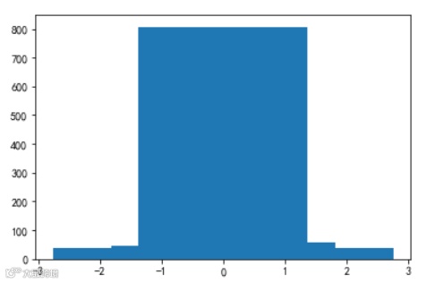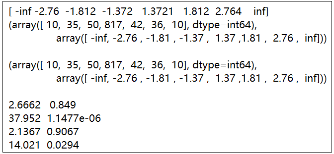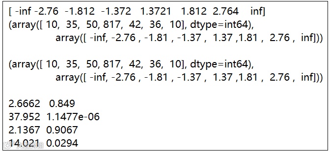 #4、卡方检验import numpy as npimport pandas as pdfrom scipy import statsx=stats.t.rvs(10,size=1000)"""用自定义的区间来做,强调了尾部,把中间当作一个,虽然中间数多但是权重小,跟其他区间的权重是一样的,将相对明显的差别单列出来,以后分析数据的时候都可以这样做,就比较某一段。"""quantiles=[0.0,0.01,0.05,0.1,1-0.10,1-0.05,1-0.01,1.0]#分位数对应的百分比--概率分布函数。crit=stats.t.ppf(quantiles,10)#确定理论的分为数在哪。# 分位数对应的百分比序列输入后,对应生成一个服从自由度为10的t分布的分位数.#cdf:累计分布函数; ppf:分位点函数(CDF的逆)print(crit)print(np.histogram(x,bins=crit))#数据x落入到分位数确定的隔段中,以及分位数形成的隔段。plt.hist(x,bins=crit)#数据x落在分位数确定的隔段中的直方图n_sample=x.size #样本x数量np.histogram(x,bins=crit)#数据x落入到分位数确定的隔段中,以及分位数形成的隔段。print(np.histogram(x,bins=crit))freqcount=np.histogram(x,bins=crit)[0]#数据x落入每段的数量--实际值。tprob=np.diff(quantiles)#分位数百分比前后作差形成每段的概率。tprob*n_sample#理论上落入每段的数量--理论值。#(这个值一般和实际值freqcount进行比较,感性认识下差别)nprob=np.diff(stats.norm.cdf(crit))#假设是正态分布,进行构造。stats.norm.cdf():正态分布累计概率密度函数.nprob*n_sample#正态分布的理论值 (这个值一般和实际值freqcount进行比较,感性认识下差别)"""卡方检验。每一块理论上应该落多少个,其实就是二项分布,在中心极限定理中:本来有多少概率落在里面,与实际落进去的有误差的,这个误差是受二项分布影响的,当二项分布数比较大的时候可以将他构造成一个正态分布,标准化后进行平方和,也就是每一块理论上都有一个概率值落在里面,但是和实际值有差别,这个差别我们认为是服从正态分布的。每一个构造为:[(理论值N0-实际值N)/sqrt(二项分布的误差nprob)]~N(0,1),将其平方和,然后将每段都加起来,构造的随机变量服从卡方分布。"""tch,tpval=stats.chisquare(freqcount,tprob*n_sample)#卡方检验。(判断p值是否拒绝原假设:数据为卡方分布)print(tch,tpval)nch,npval=stats.chisquare(freqcount,nprob*n_sample)#看看是否符合正态分布print(nch,npval)"""最终结果是:不能拒绝它是来自t分布,但是拒绝它是来自正态分布的。为什么要用卡方分布呢:对尾部特别感兴趣的时候,就需要检验下。卡方检验完全是自己构造,对于区间完全是自己选的,尾部有多少自己来定。非常强大的比k-s还要强大。卡方检验是根据(每个区间的)分布函数来算的,每段理论有多少个和实际多少个进行比较的。还有一种是根据样本来估计一些数字特征来检验。"""# 基于样本估计的数字特征进行卡方检验tdof,tloc,tscale=stats.t.fit(x)#用t分布去模拟数据,输出最好的变量:自由度,期望,方差。nloc,nscale=stats.norm.fit(x)#用正态分布去模拟现在的样本tprob=np.diff(stats.t.cdf(crit,tdof,loc=tloc,scale=tscale))#这个是用理论值算出来的,刚才的是分位数算出来的。nprob=np.diff(stats.norm.cdf(crit,loc=nloc,scale=nscale))tch,tpval=stats.chisquare(freqcount,tprob*n_sample)print(tch,tpval)nch,npval=stats.chisquare(freqcount,nprob*n_sample)print(nch,npval)"""两种结果可能都不能拒绝,这种方法也不是太好。为什么不如直接刚才的尾部卡方检验好呢?因为在中间核心的部分,正态分布和t分布还是比较像的,只是在尾部比较像的,全体的去考虑,用一个拟合曲线去考虑,尾部的区别被中间相同性掩盖了。"""