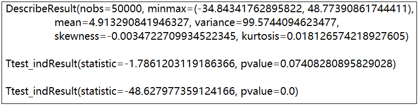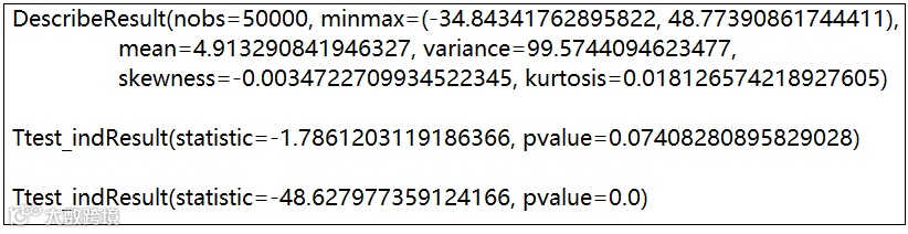 # 两个样本的检验import numpy as npfrom scipy import statsrvs1=stats.norm.rvs(loc=5,scale=10,size=50000)#均值为5,标准差为10的正态分布,随机随机生成50000个样本display(stats.describe(rvs1))#输出统计特征值rvs2=stats.norm.rvs(loc=5,scale=10,size=50000)display(stats.ttest_ind(rvs1,rvs2))#对两个样本进行t检验,pvalue即p值,接受原假设,# 即样本均值和理论均值不存在差异rvs3=stats.norm.rvs(loc=8,scale=10,size=50000)display(stats.ttest_ind(rvs1,rvs3))#p=0.0,拒绝原假设,即样本均值和理论均值存在差异