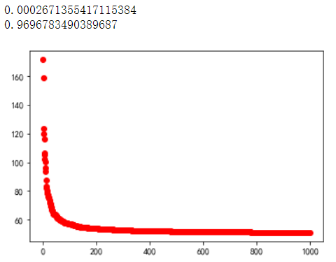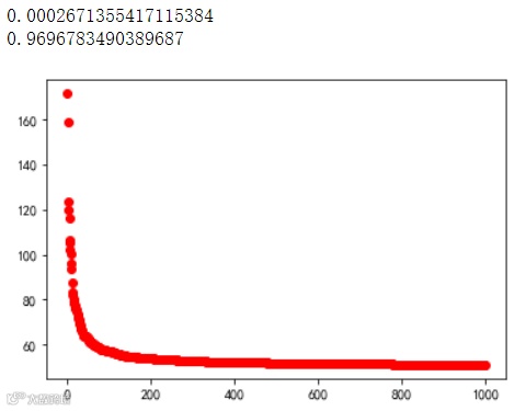 #帕累托分布#P(X>x)=(x/xmin)**(-k)#E(P)=xmin*k/(k-1)#构造一组帕累托分布,均值为50,k值(shape为1.2),# 且具有大于1000的点#size为多少才有把我里面有大于1000的数x=stats.pareto.rvs(b=1.2,loc=50,size=1000)p=1-stats.pareto.cdf(1000,b=1.2,loc=50)print(p)#0.0002671355417115384 不存在print(1-stats.binom.cdf(1,20000,p))#0.9696783490389687plt.plot(-np.sort(-x),"ro")plt.show()