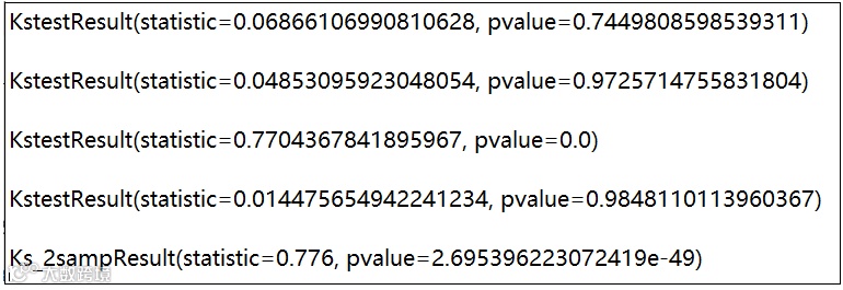 import numpy as npfrom scipy import statsx1 = stats.t.rvs(10, size=100)x2 = stats.norm.rvs(loc=10,scale=10,size=1000)display(stats.kstest(x1,'t',(10,)))#x1是否服从自由度为10的t分布,p>0.05接受原假设,服从t分布display(stats.kstest(x1,'norm',(x1.mean(),x1.std())))#x1是否服从正态分布,p>0.05接受原假设,服从正态分布#使用K-S test对x进行t分布和正态分布检验时,#如不能拒绝(因正态分布和t分布在中间时候很像,但尾部有显著差别)#这时候就用卡方检验...display(stats.kstest(x2,'t',(10,)))#x2是否服从自由度为10的t分布,p<0.05拒绝原假设,不服从t分布display(stats.kstest(x2,'norm',(x2.mean(),x2.std())))#x2是否服从正态分布,p>0.05接受原假设,服从正态分布display(stats.ks_2samp(x1,x2))#检查两样本之间是否存在差异,p<0.05,拒绝原假设