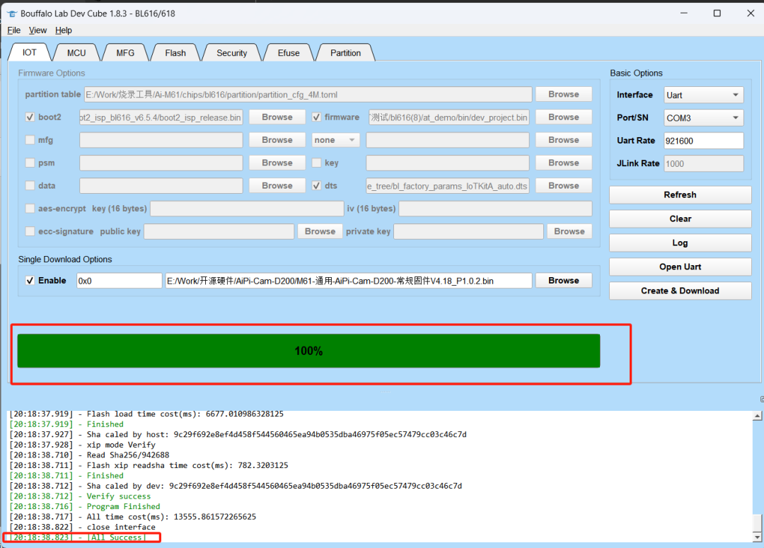 若使用安信可淘宝店购买的CP2102,波特率选择921600,若有FT232芯片则可以选择2000000。开发板串口芯片为340C,也可以选择2000000。