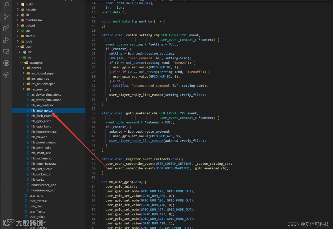 我们需要在这个SDK中添加一个退出唤醒关闭蓝色LED灯的功能,所以需要看一下代码。我们定制的SDK的功能默认是在user/src/examples/hb_auto_gpio.c 中,所使用的Demo是USER_DEMO_AUTO_GPIO :