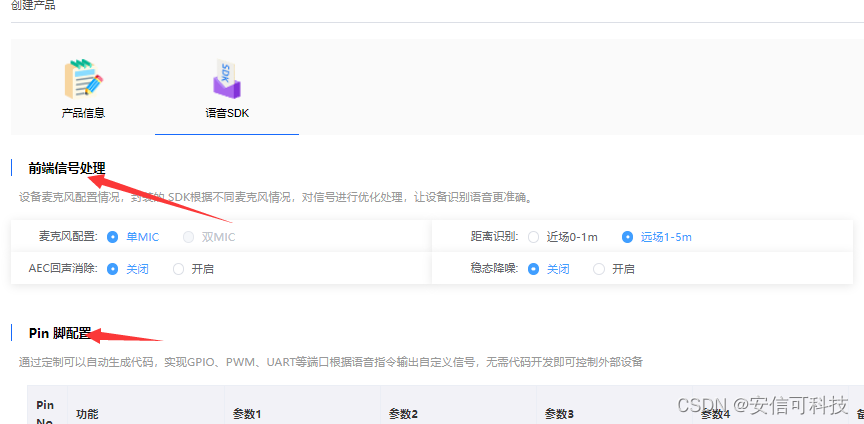 在语音SDK选项中,前端信号处理、Pin脚配置保持默认