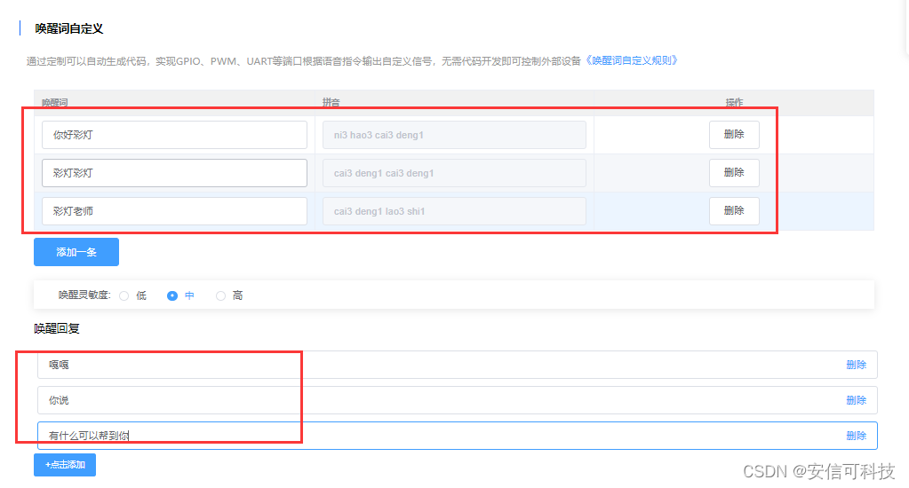 · 回复语:即命令词对应的回复语,多个回复语用 “ | ”隔开,必填