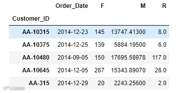 F(Frequency):客户在最近一段时间内交易的次数。F值越大,表示客户交易越频繁,反之则表示客户交易不够活跃。 -