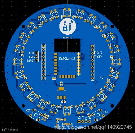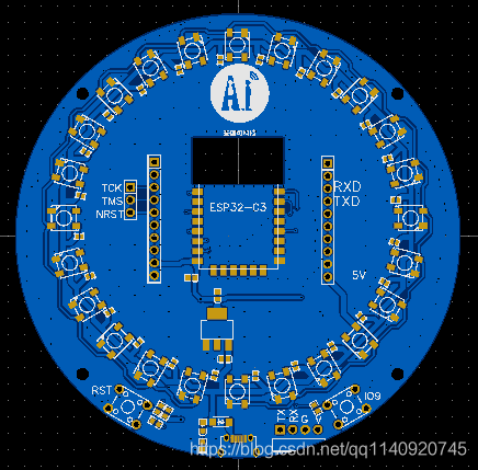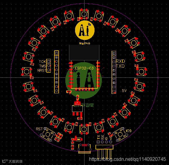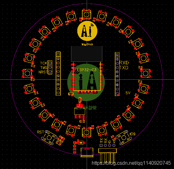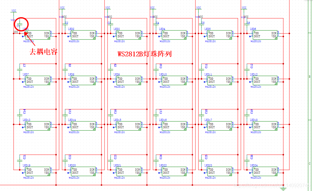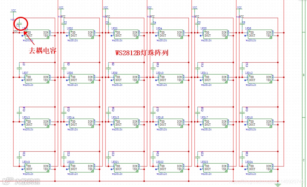 博主用了24颗WS282灯珠,每颗灯珠都有一个去耦电容,防止灯珠互相干扰,灯珠之间采用并联的方式接入(这种元件排列方式可以自动生成)。