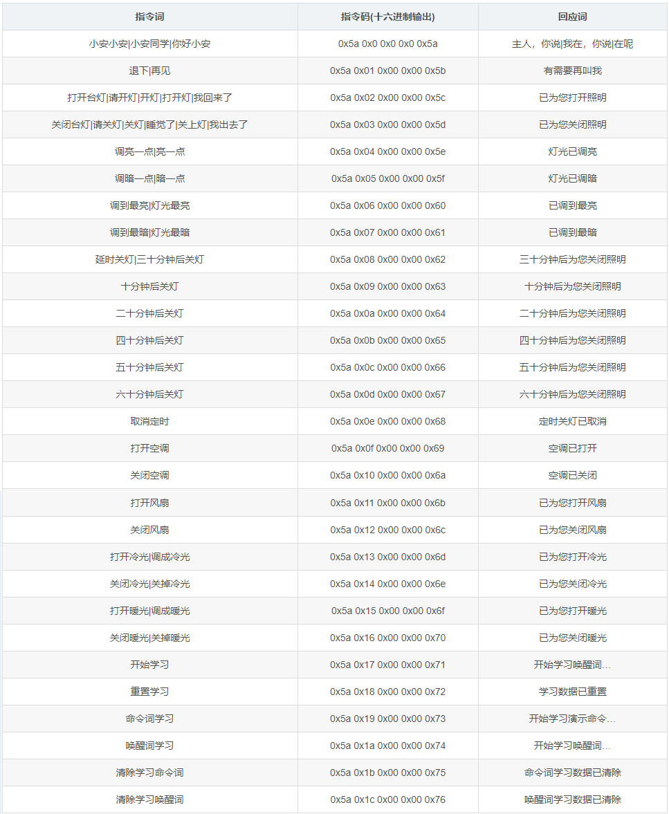 指令序号:代表唯一的指令:0x00为唤醒词的序号