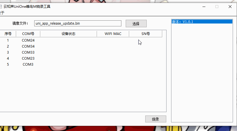 串口烧录的方式使用TTL模块进行固件升级,对模块没有任何要求,使用的软件是:UniOneUpdateTool.exe,一般固件的文件名为:uni_app_release_update.bin