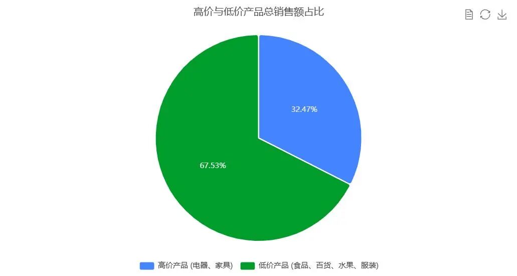 饼图展示了高价产品(电器、家具)和低价产品(食品、百货、水果、服装)的总销售额占比。通过该图可以直观地看到两类产品在总销售额中的比例分布。