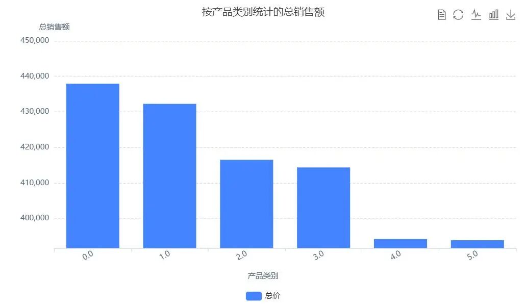 从柱状图中可以看出,百货类别的总销售额最高,而电器类别的总销售额最低。通过按产品类别统计的总销售额,可以直观地看到不同类别的销售表现。