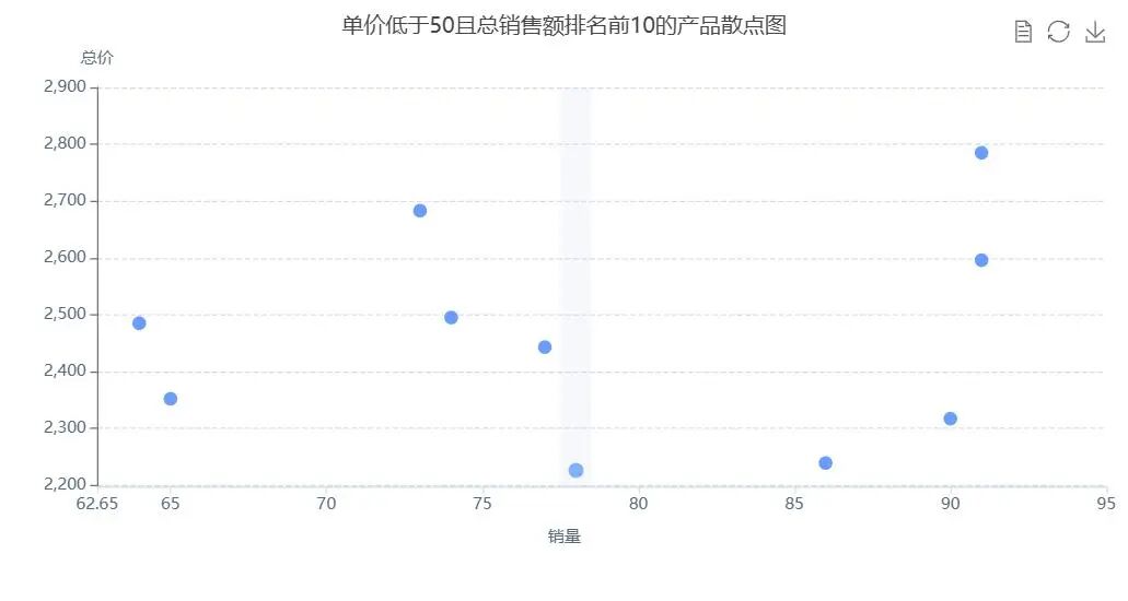 散点图展示了单价低于50且总销售额排名前10的产品,X轴代表销量,Y轴代表总价。通过该图可以直观地看到这些产品的销量与总销售额之间的关系。