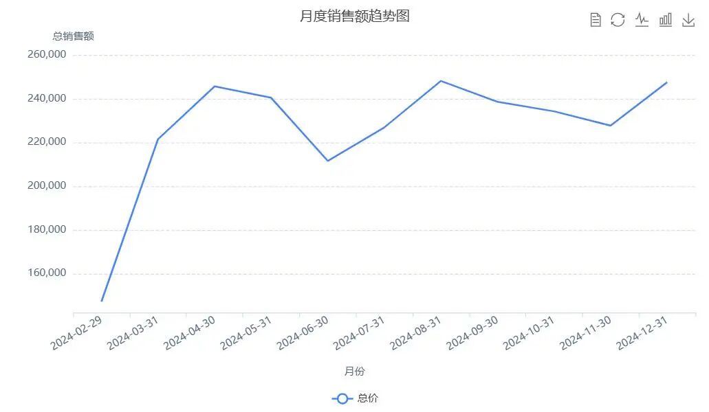 从每个月的平均销售额来看,销售额在年末(12月)达到最高,而年初(2月)的销售额最低。这种趋势表明存在一定的季节性变化,可能与消费者的购物习惯有关,例如年末的节假日促销活动导致销售额上升,而年初的消费相对较少。