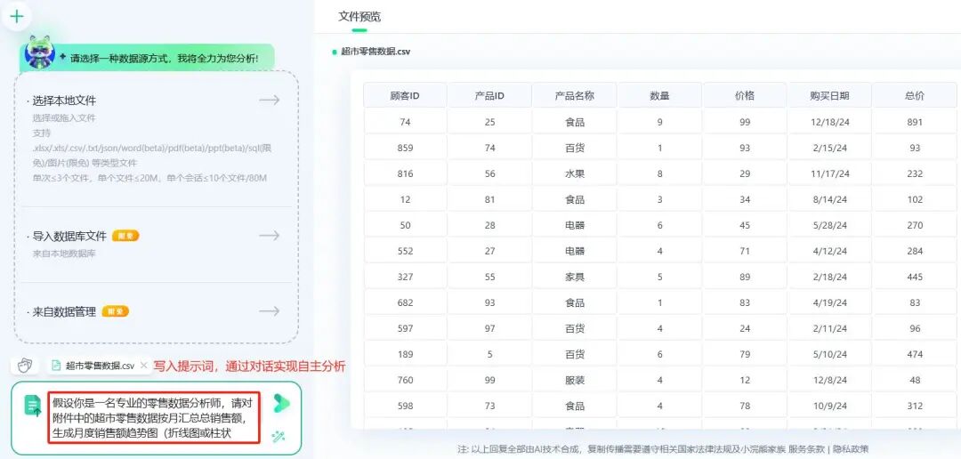 点击选择本地文件可以上传数据源表格,界面如下,当然,目前小浣熊也支持从数据库中直接上传数据,本节使用一组超市零售数据,包含顾客ID、产品ID、产品名称、数量、价格、购买日期、总价这几个数据字段。