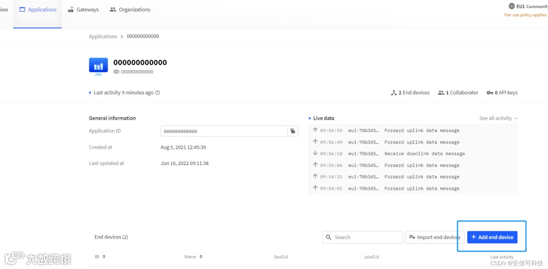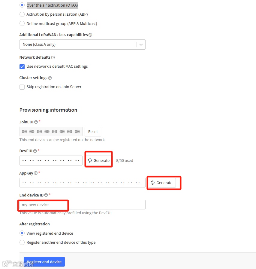 进入已经创建的应用页面点击Add end device开始添加节点设备,可以根据需求填入预设配置或是点击Generate自动生成新的Key。点击Register end device完成创建。