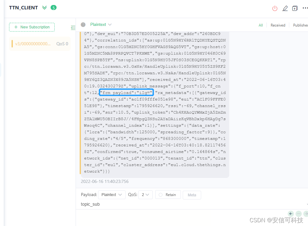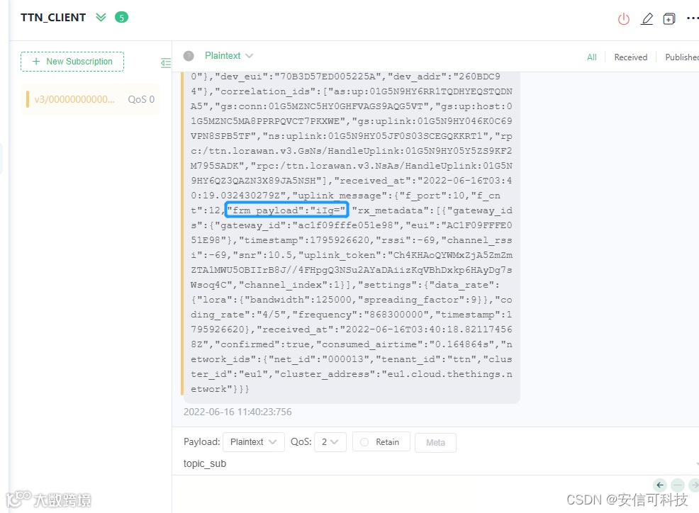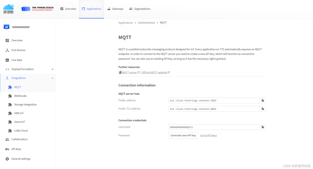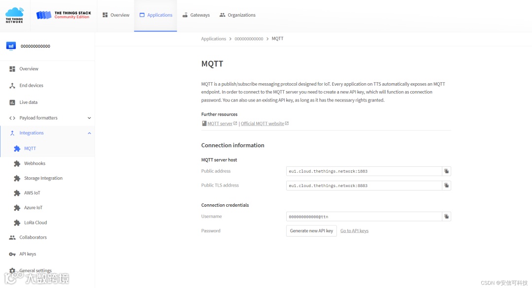 通过MQTT CLIENT获取TTN服务器数据, 实现数据获取/下发。连接的MQTT SERVER URL与端口及登录用户信息可在TTN页面中获取。