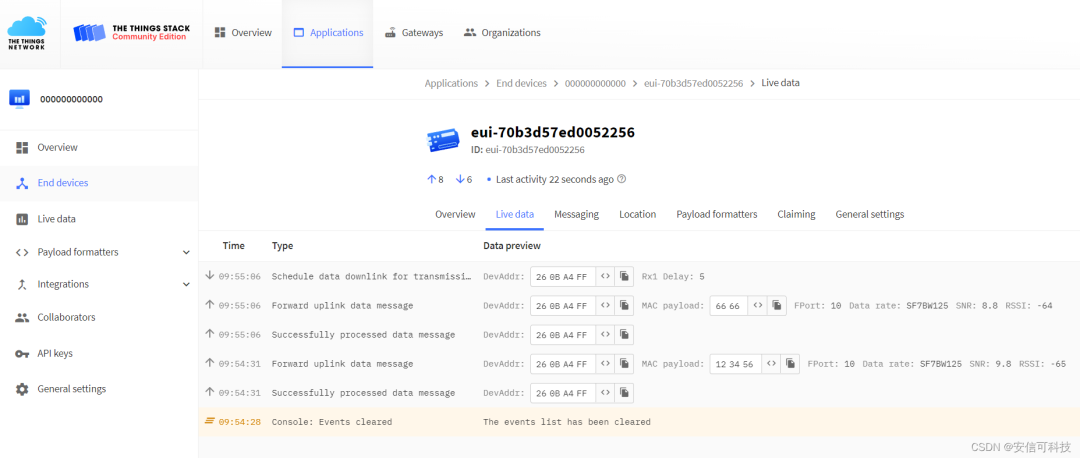 完成上述AT指令执行操作,若设备正常连接网关,在TTN管理页面我们能够看到设备的连接日志,以及上行的数据信息。