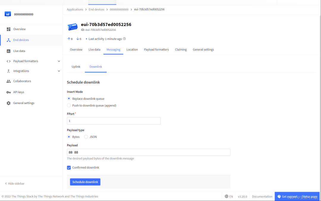 点击Messaging选项支持手动下发数据至设备。注: 当设备上传数据时,才会获取到网关最新下发的数据。