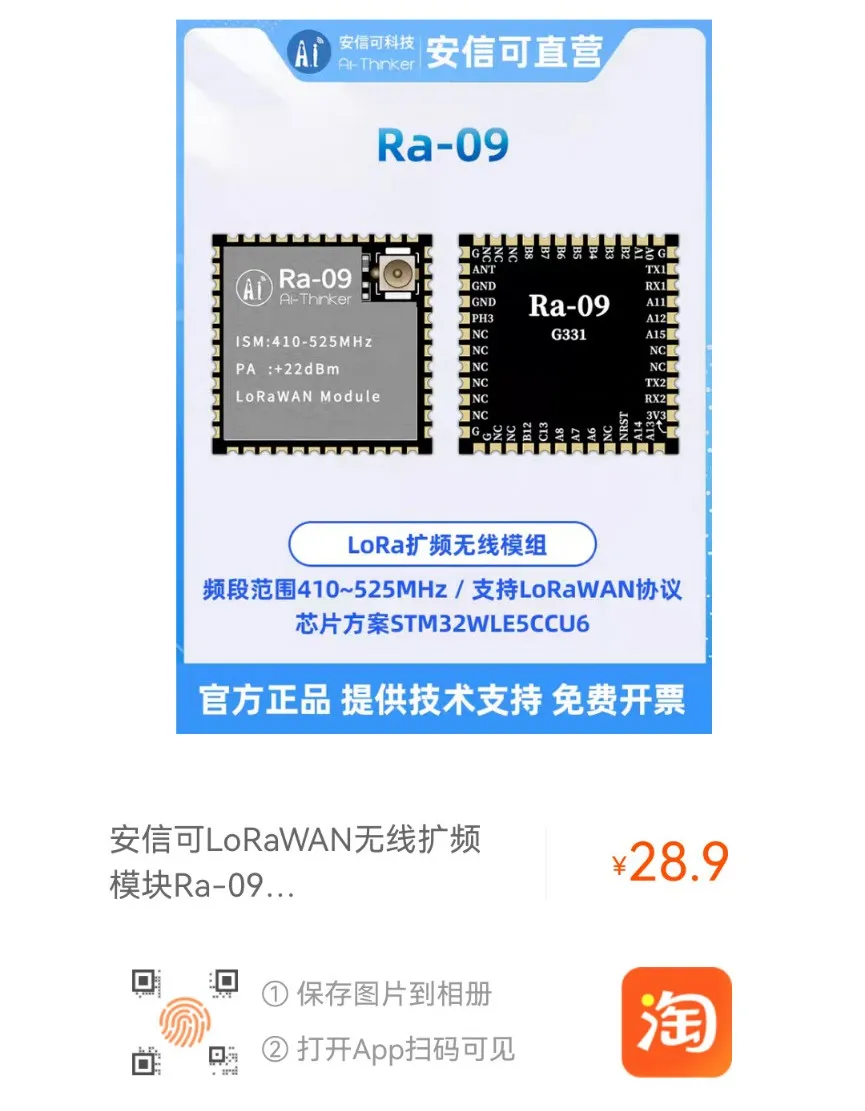 Ra-09 是由深圳市安信可科技有限公司设计开发的一款 LoRa 模组,该模组用于超长距离扩频通信。其芯片 STM32WLE5CCU6 是通用的 LPWAN 无线通信SoC,集成了射频收发器、调制解调器和 32-bit Arm® Cortex®-M4 MCU。该 MCU 采用ARM内核,工作频率可达 48MHz。