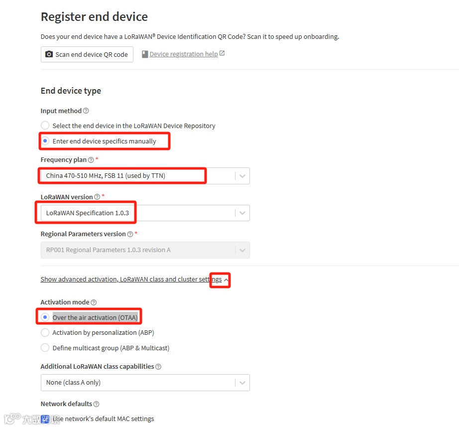 在设备创建环节能够配置设备将要采用的连接方式OTAA: