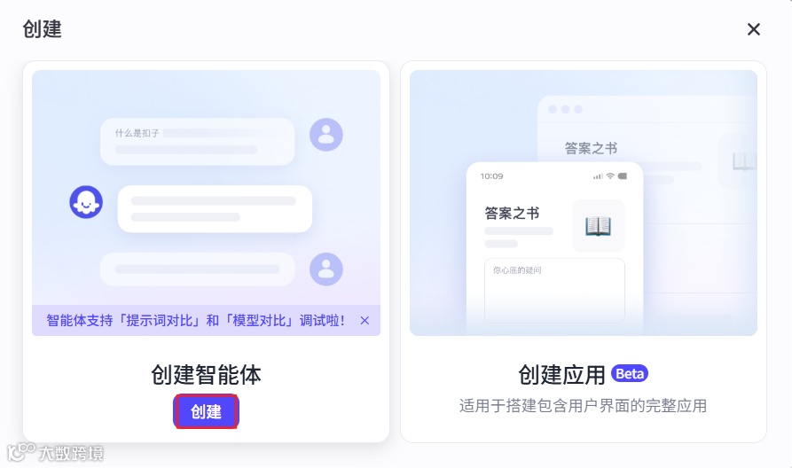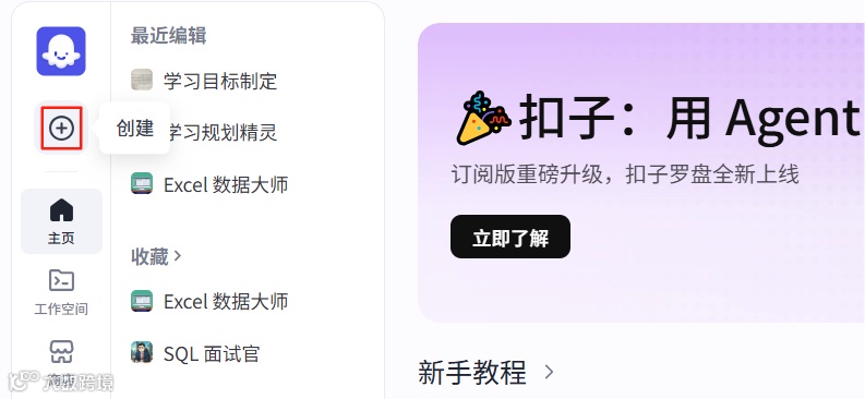 下面我将详细介绍如何使用扣子搭建一个关于数据分析知识的智能体,这样可以基于我们学习到的数据分析知识来精准回答数据分析问题,在泛知识的时代,这种学习方式更利于我们学习和掌握数据分析知识,先登录扣子平台,在页面左上角单击⊕创建智能体。