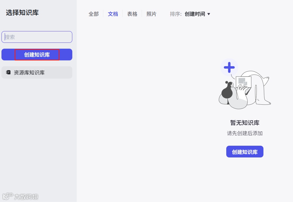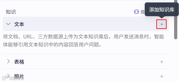 接下来添加知识库,点击文本右边的加号,添加知识库。