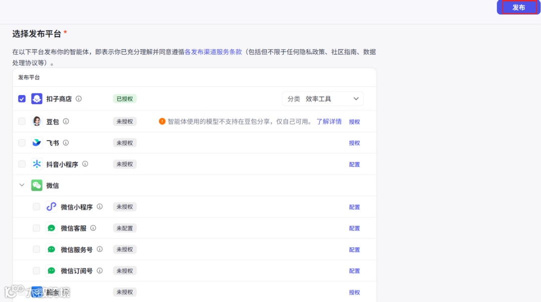 测试没有问题,就可以点击发布,扣子智能体支持多个平台,可以按照使用需求去设置。
