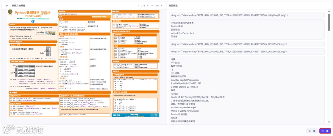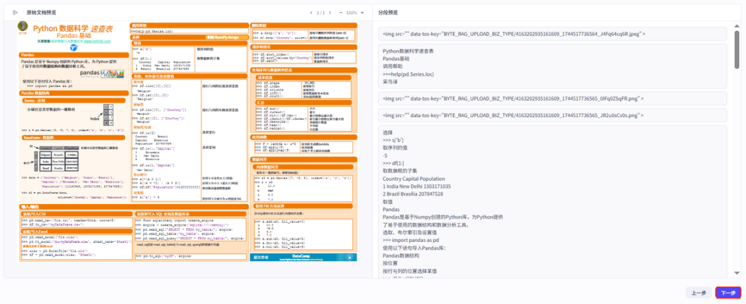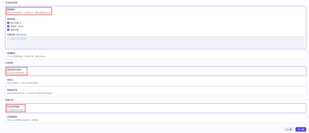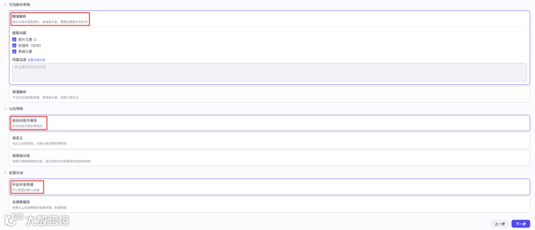 然后选精准解析、自动分段与清洗、平台共享存储,点击下一步。