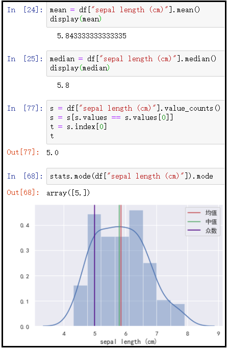 4)代码:计算鸢尾花数据集中花萼长度的均值、中位数、众数