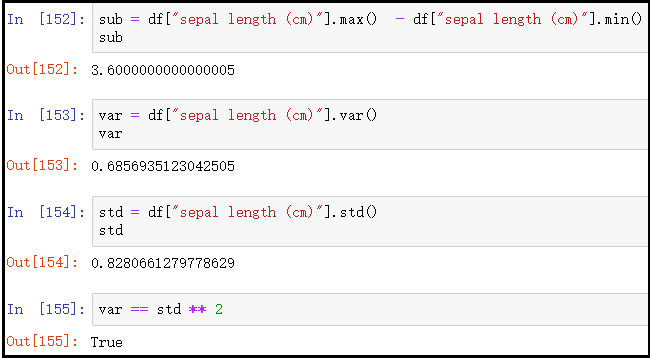 3)代码:计算鸢尾花数据集中花萼长度的极差、方差、标准差