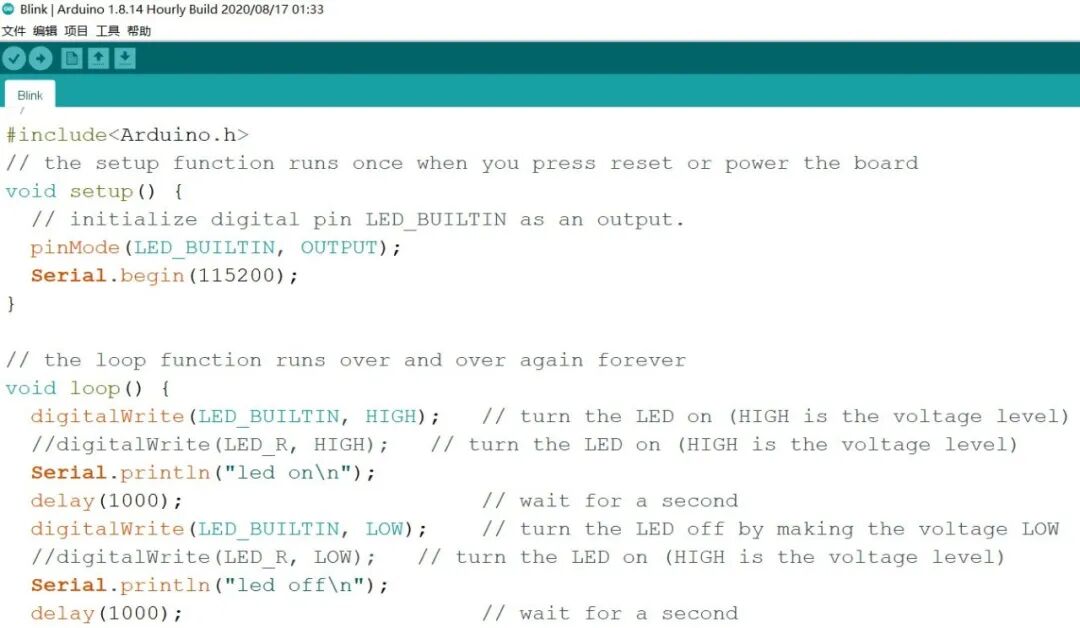 点开示例->1.BASIC->blink,