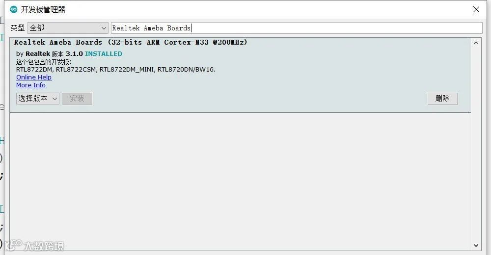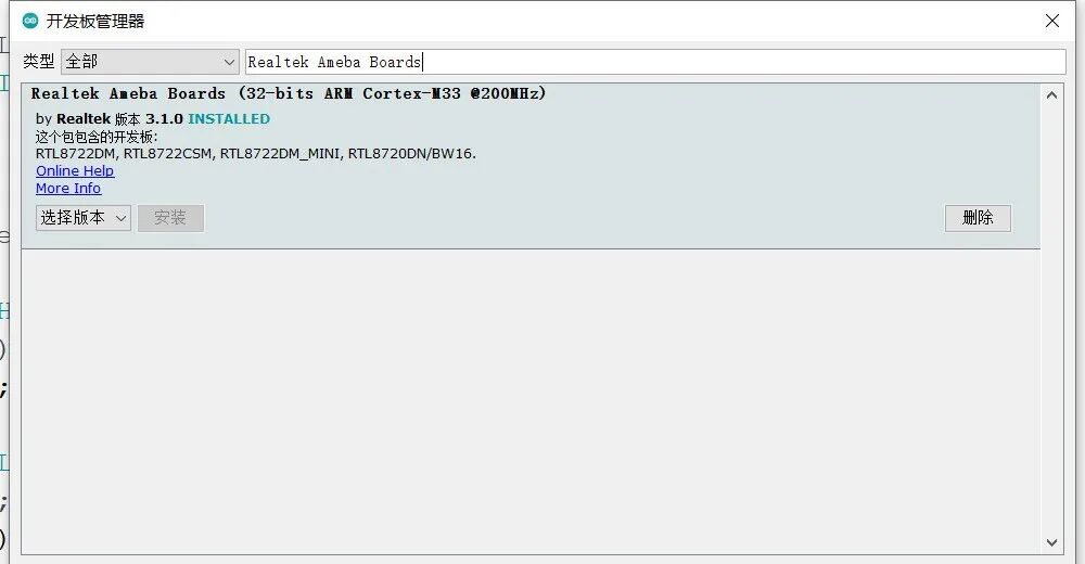 之后打开工具->开发板->开发板管理器,搜索“Realtek Ameba Boards”